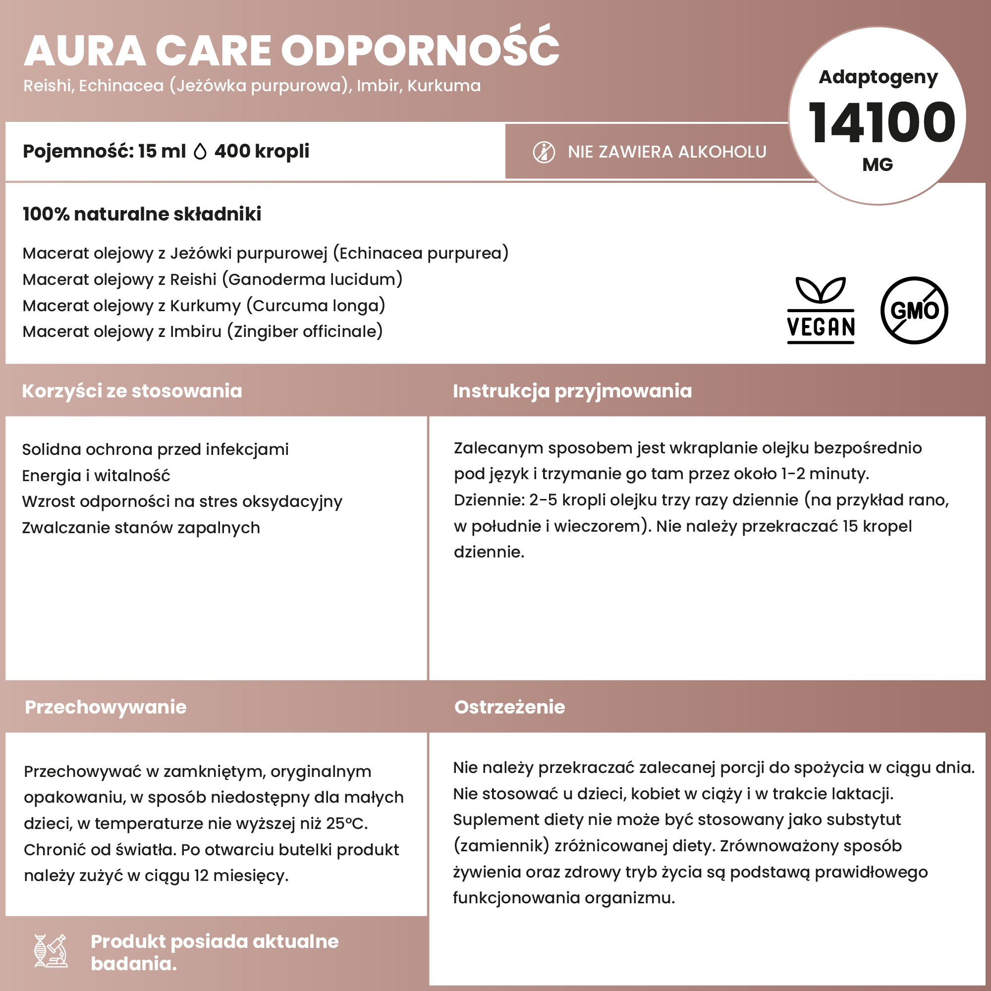 Formuła w formie wegańskiego maceratu olejowego – wolna od alkoholu, mikroplastiku i zbędnych dodatków – zapewnia wysoką biodostępność składników i łatwe stosowanie w codziennym życiu. Idealna w okresach zwiększonego ryzyka infekcji, intensywnego trybu życia lub obniżonej odporności.