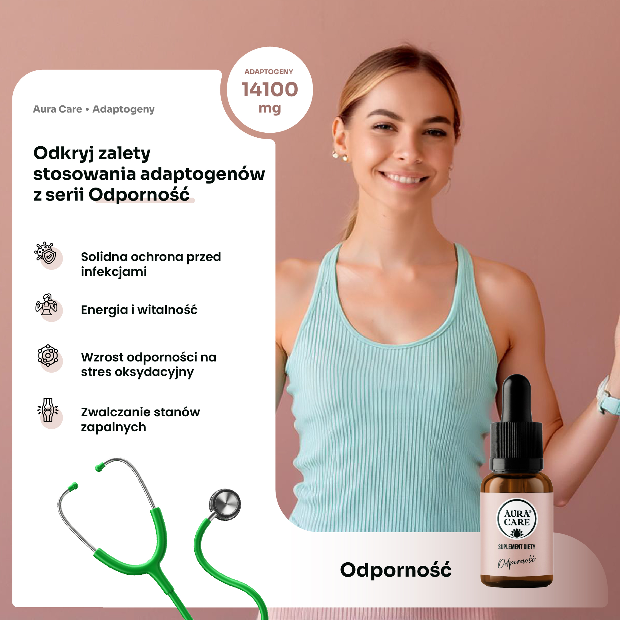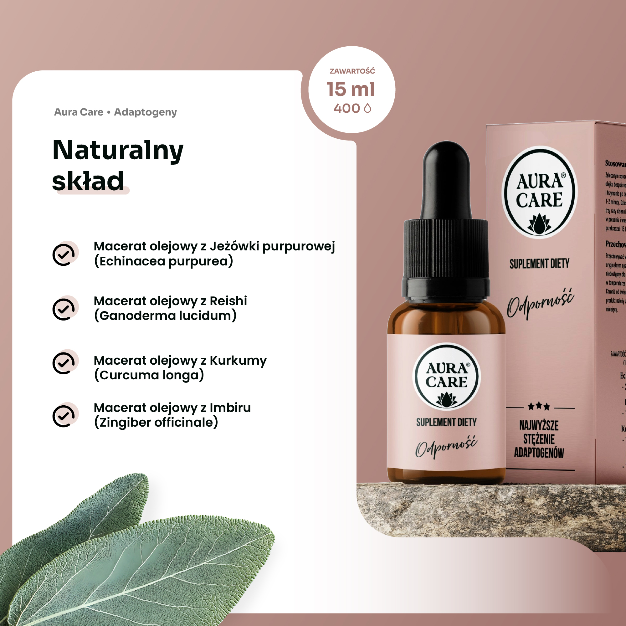 Aura Care Odporność to zaawansowana formuła adaptogenów oraz starannie dobranych ziół, która wspiera naturalny układ odpornościowy, zwiększa witalność i pomaga zachować równowagę w obliczu infekcji i stresu. W każdej porcji znajduje się aż 14 100 mg aktywnych składników roślinnych – m.in. Reishi, Jeżówka purpurowa (Echinacea), Imbir oraz Kurkuma. Produkt został stworzony z myślą o osobach, które poszukują kompleksowego wsparcia odpornościowego oraz naturalnych sposobów na wzmocnienie organizmu.