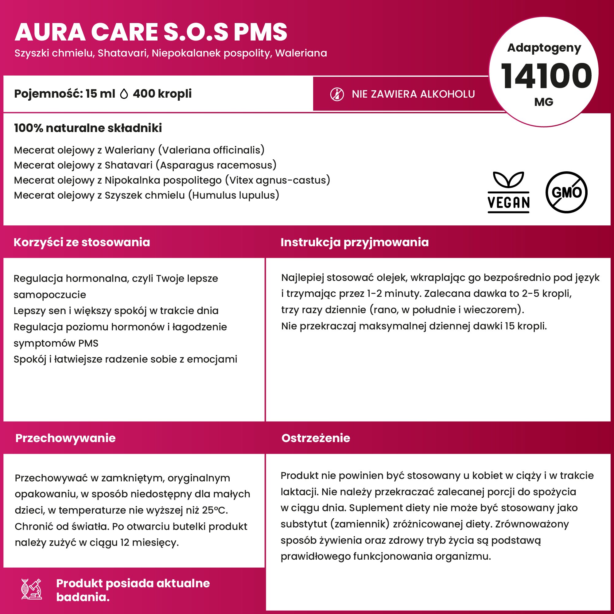 Aura Care S.O.S PMS to precyzyjnie dobrany kompleks adaptogenów i ziół stworzony dla kobiet, które w trudnych dniach cyklu miesiączkowego szukają naturalnego wsparcia dla nastroju, napięcia i równowagi hormonalnej. Każda porcja zawiera aż 14100 mg składników aktywnych – Szyszki chmielu, Shatavari (Asparagus racemosus), Niepokalanek pospolity (Vitex agnus-castus) i Walerianę (Valeriana officinalis). Formuła ta działa kojąco, wspiera naturalne procesy organizmu i łagodzi objawy PMS, poprawiając komfort psychiczny i fizyczny.